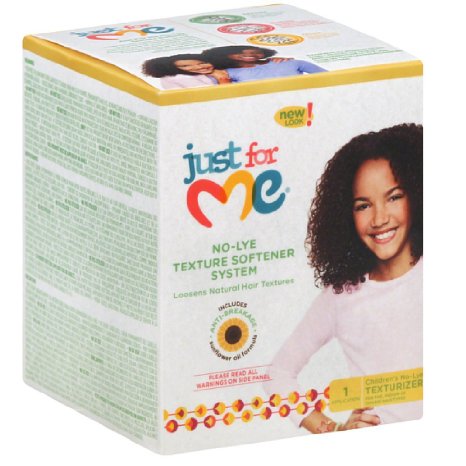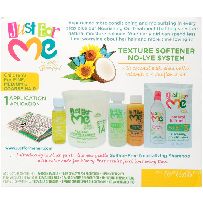 Soft & Beautiful Just For Me No Lye Texture Softener Kit is for children ages 5+ to help softens natural hair texture to make the hair more manageable during combing. New color-code Neutralizing Shampoo turns blue when relaxer is still present in hair; helps reassure moms when hair is rinsed thoroughly.